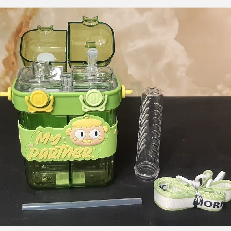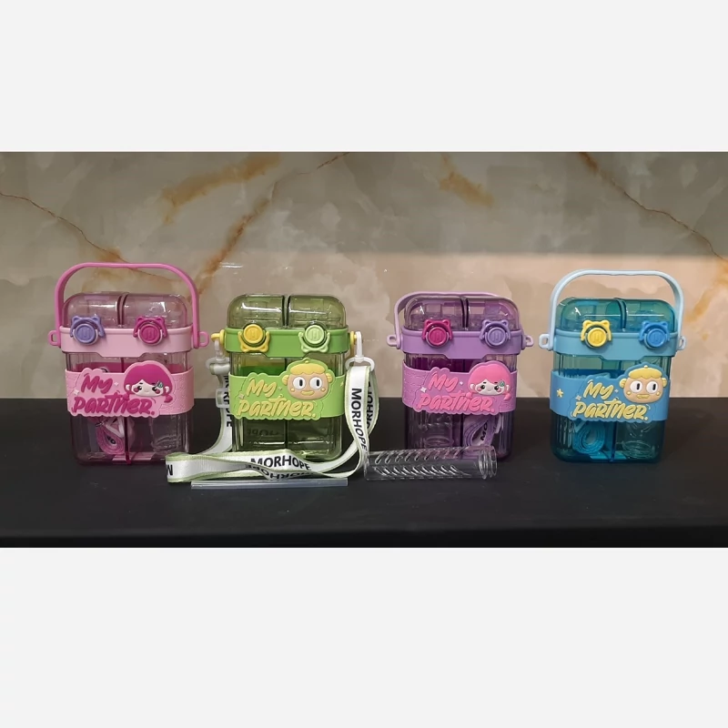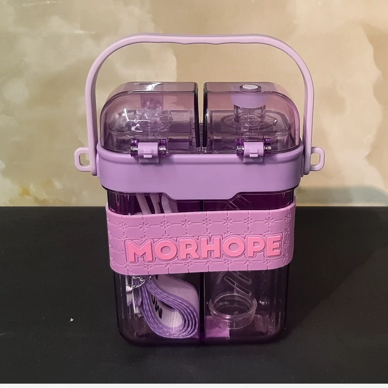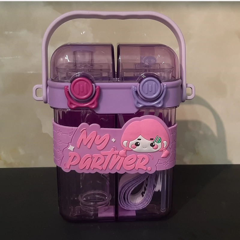 قمقمه دو مخزنه نشکن دارای جا میوه ای داری یک درب نی نوش یک درب آسان نوش دارای بند بلند