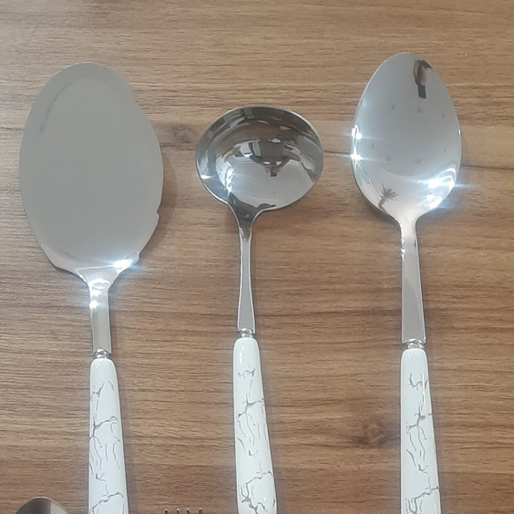 سرویس کامل سرامیکی شامل : قاشق و چنگال غذاخوری_ کارد و چنگال میوه خوری_ قاشق شربت و چایی_ کارد کره_ کفگیر، ملاغه و قاشق سالاد